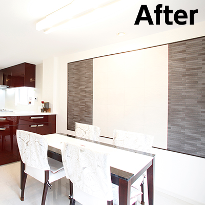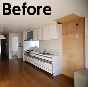 古いマンションですので、面積は広いのですがキッチンとリビングの区別がなく、なんとなく落ち着かない空間でした。思い切って対面型のキッチンにし、リビングを広くとりました。空間が仕切られたせいで、どいちらにいても落ち着きます。 壁も明るいクロスにして、変化もつけました。(茨城県 K.I.様)