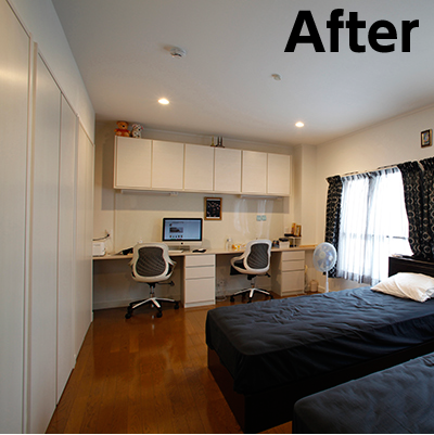 古いマンションですが面積は広く、各居室もそれぞれ広く作られています。今回は主寝室をリフォーム。お互いに仕事をもっているので、デスクも必要でした。それに合わせて壁一面を収納にして、古くなったタンスを処分。衣類などたっぷり収納できます。 かたずけがしやすいので、いつも広々過ごせています。(杉並区 D.K.様)