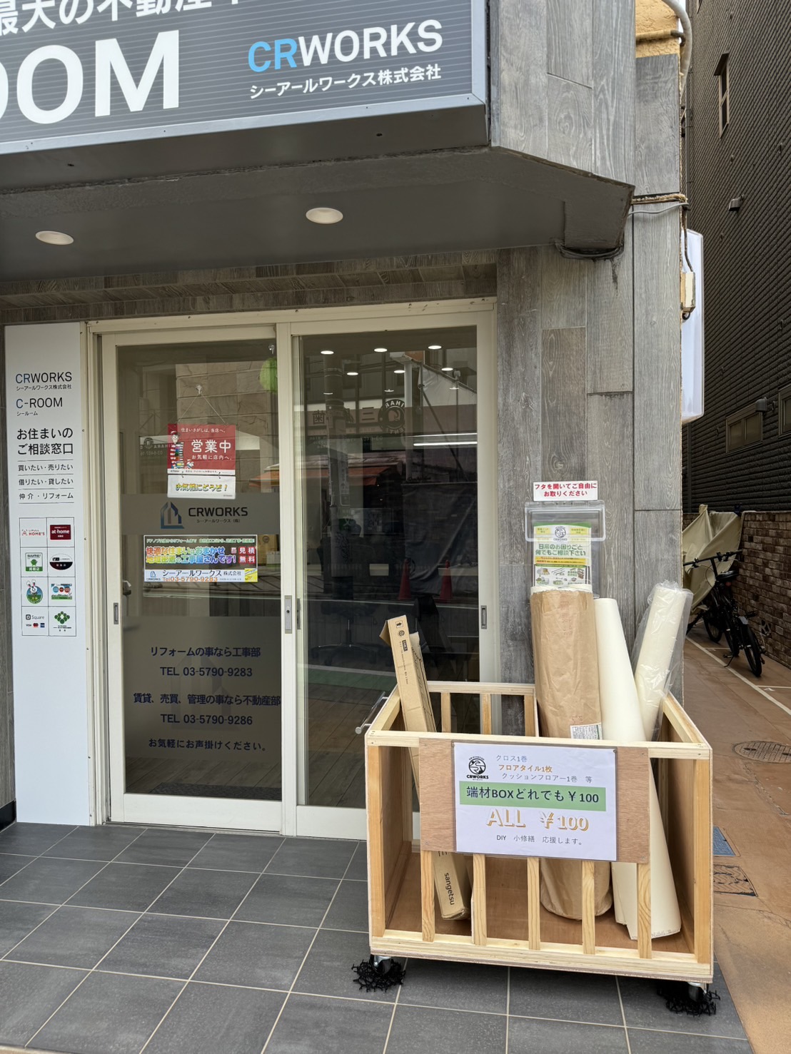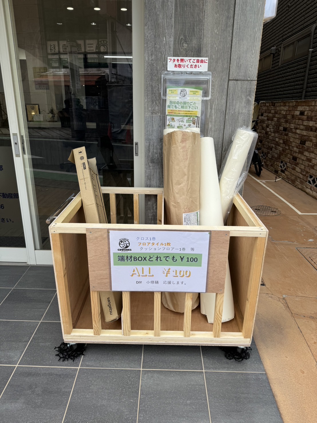 現場で出たクロスやフロアタイルの端材を格安でお譲りしています。お近くの方で小さな修繕などでご入用でしたらぜひお立ち寄りください。