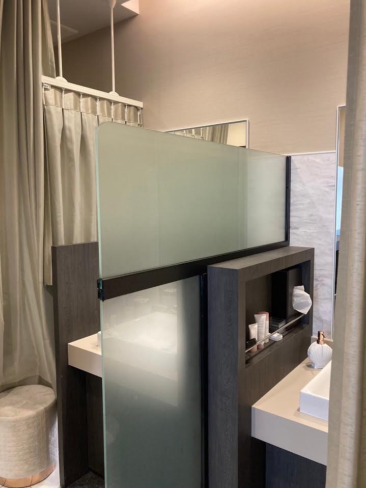 メイク台の仕切りガラスつくってほしいとのご依頼を頂きました。縦横にフレームを設置し曇りガラスを設置しました。収まりもよくご満足いただけました。