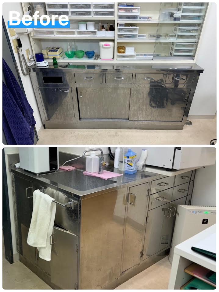 長年使用してきたステンレスキャビネットを綺麗にしたいと言うご依頼。全体を清掃し化粧シートで仕上げました。施術室も明るくなりました。(中央区)作業時間6時間