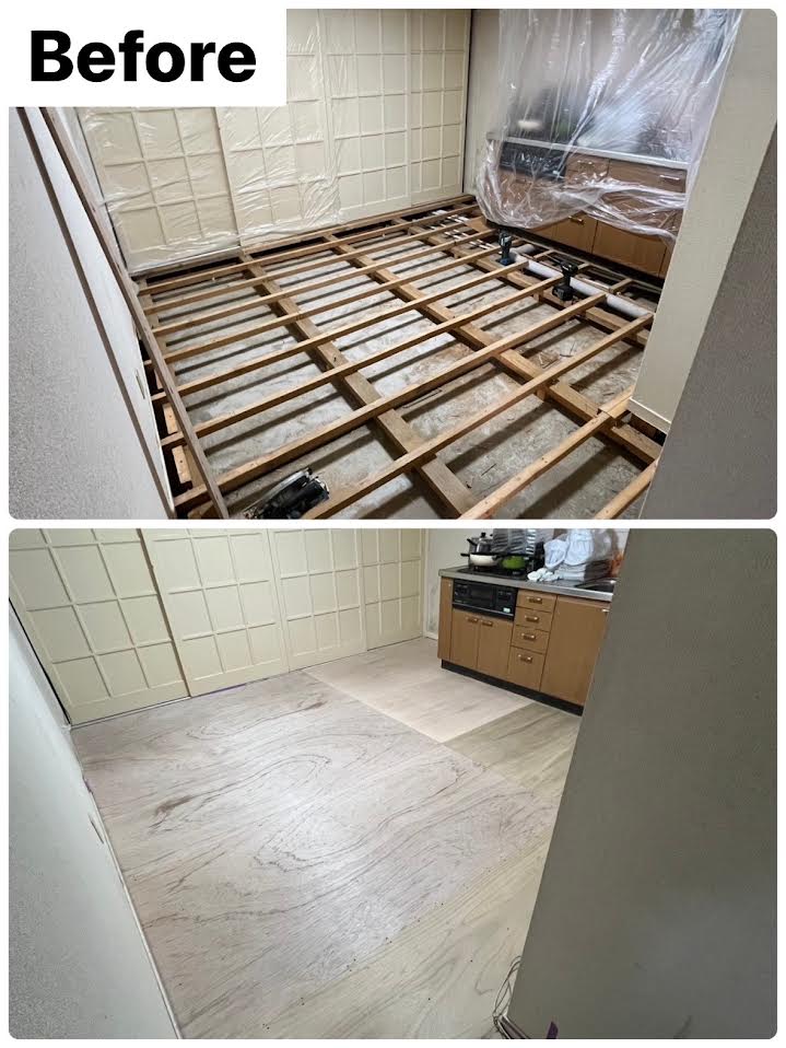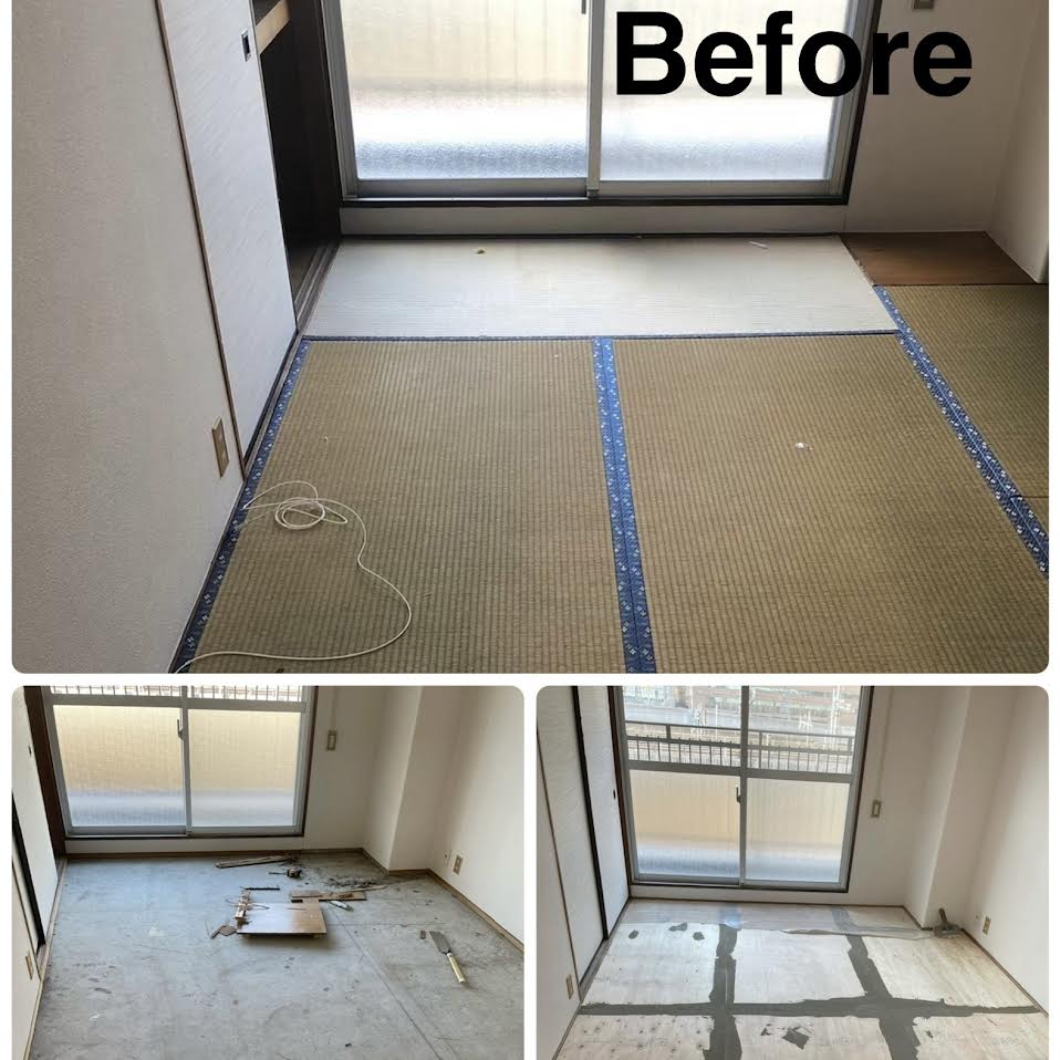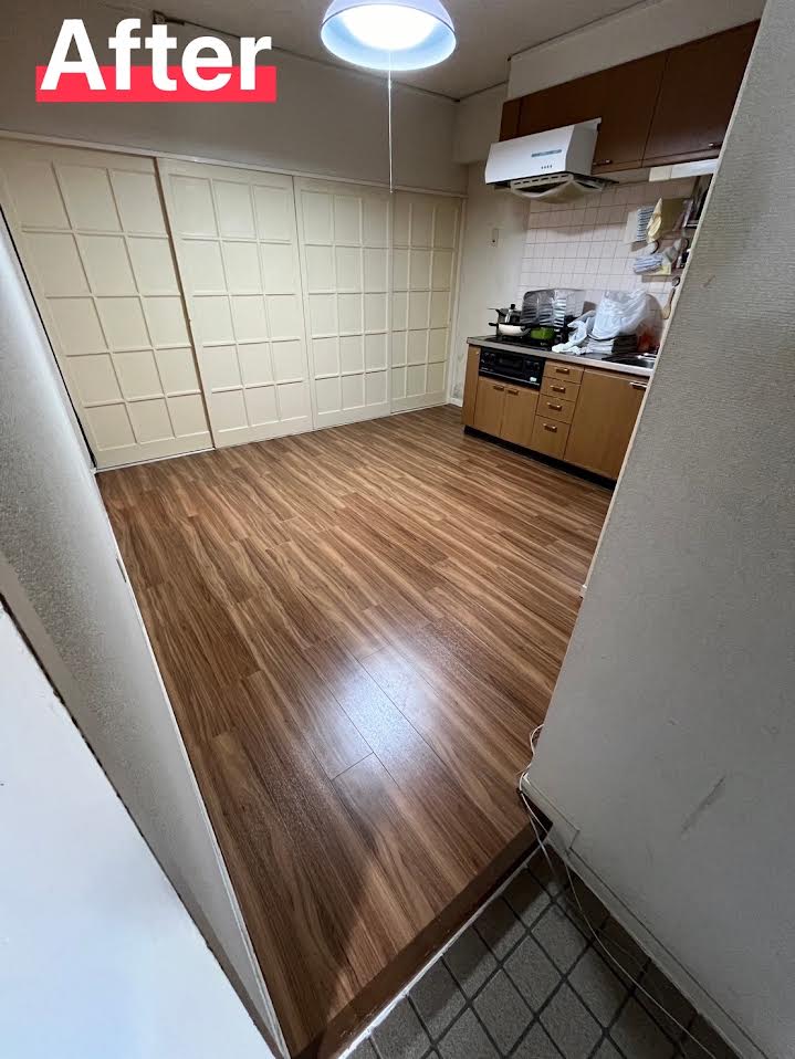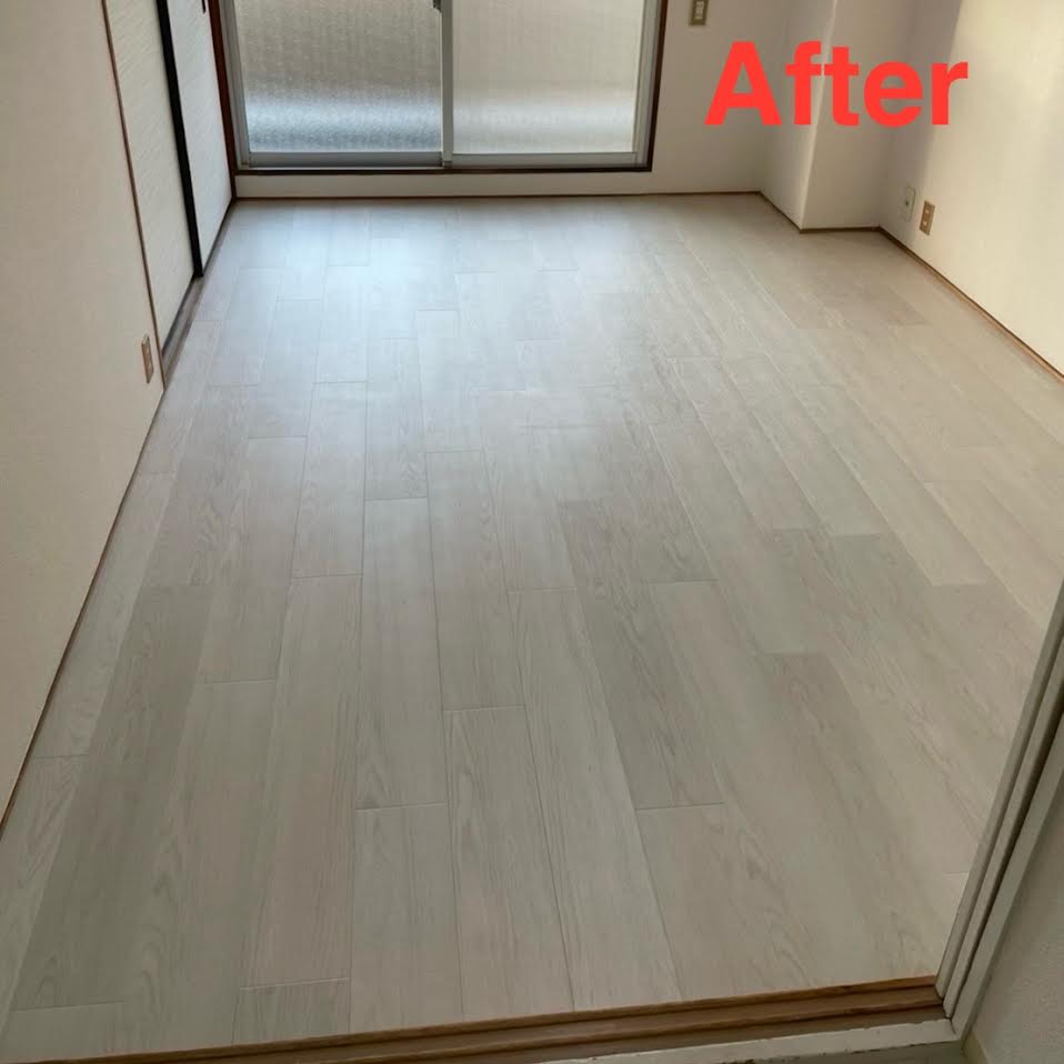 投資用マンションのオーナー様。6畳の和室を洋室に変えたいとのご依頼を頂きました。畳を撤去し下地を組みなおしてフロアタイルで仕上げました。中々決まらなかった入居もこの後すぐに決まったと大変ご満足頂けました(港区K様)作業時間1日