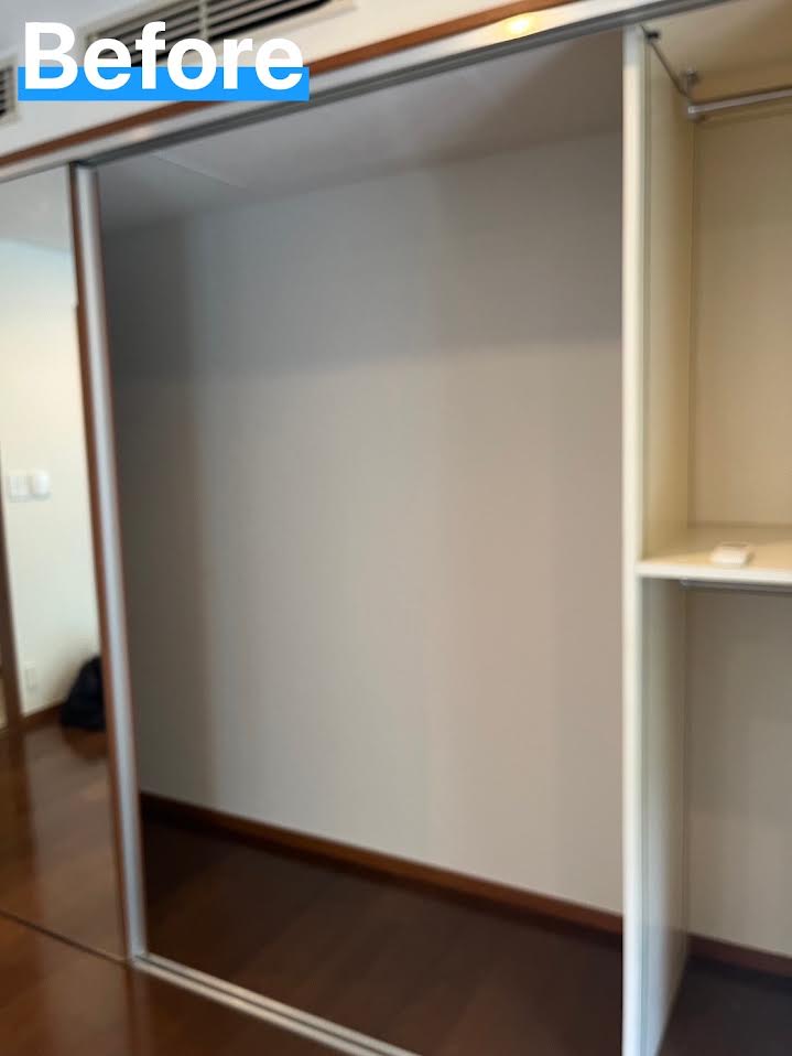 デットスペースにハンガーパイプを取り付けて欲しいとの依頼。 下地が無く何度も落ちてしまって困っていた。 下地を補強し天井からも吊って補強しました。 服も100着掛けられると満足頂けました。(中野区 I様)工事時間3時間