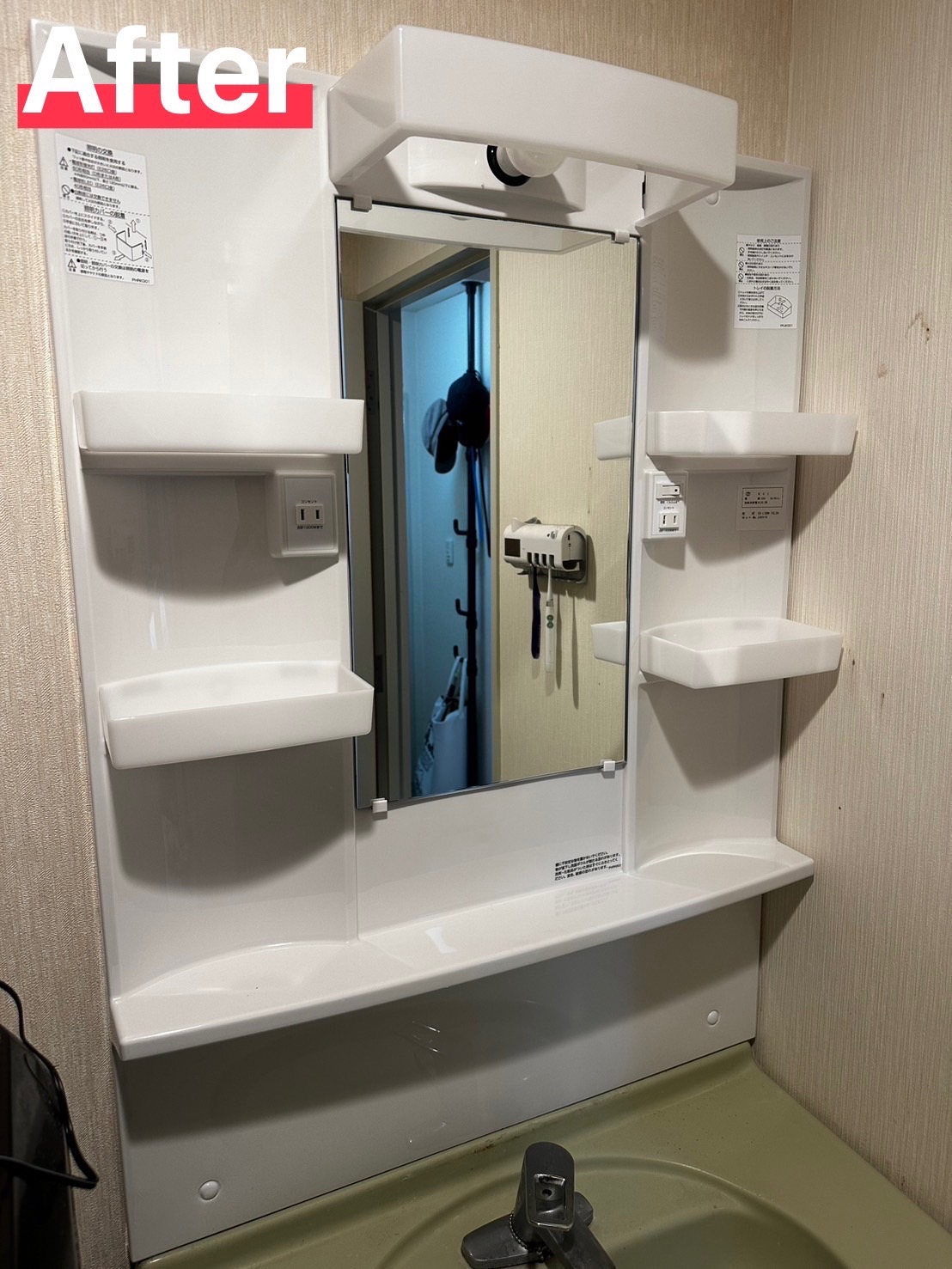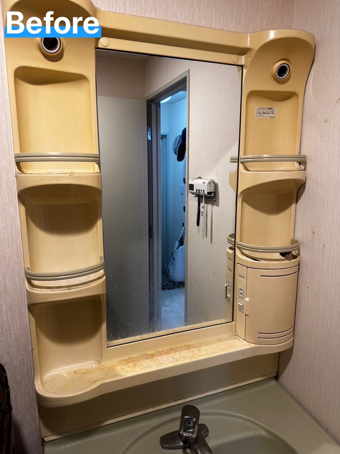 長年使用してきた洗面台のミラーキャビネット。経年劣化により破損していました。修理を検討いたしましたが交換の方が費用も安く、早く、綺麗になる事から交換いたしました。洗面所も明るくなりました。