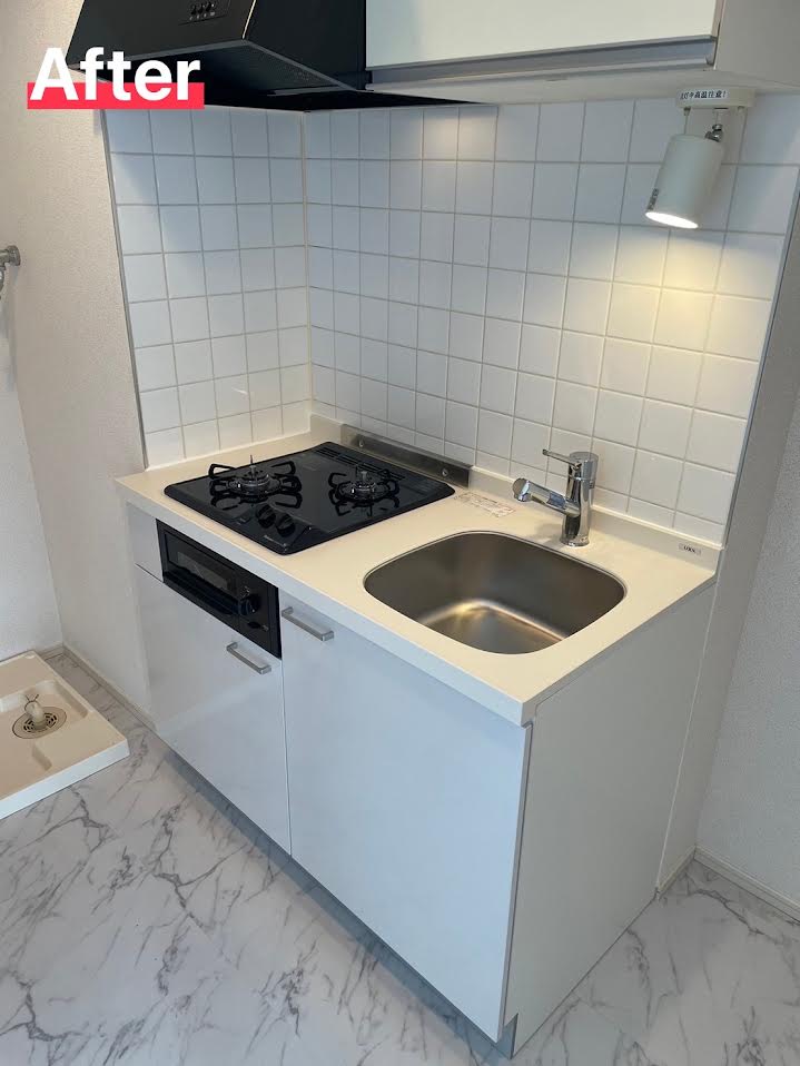 賃貸マンションに限らず、この規模のキッチン交換ならば交換は半日で可能です。水回りの交換もご相談ください。