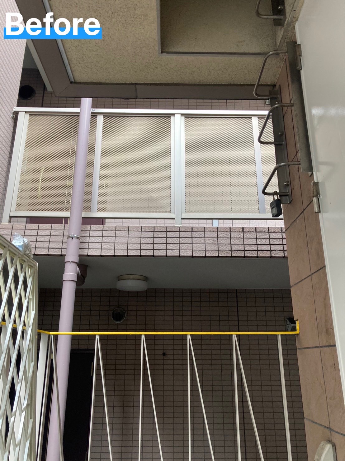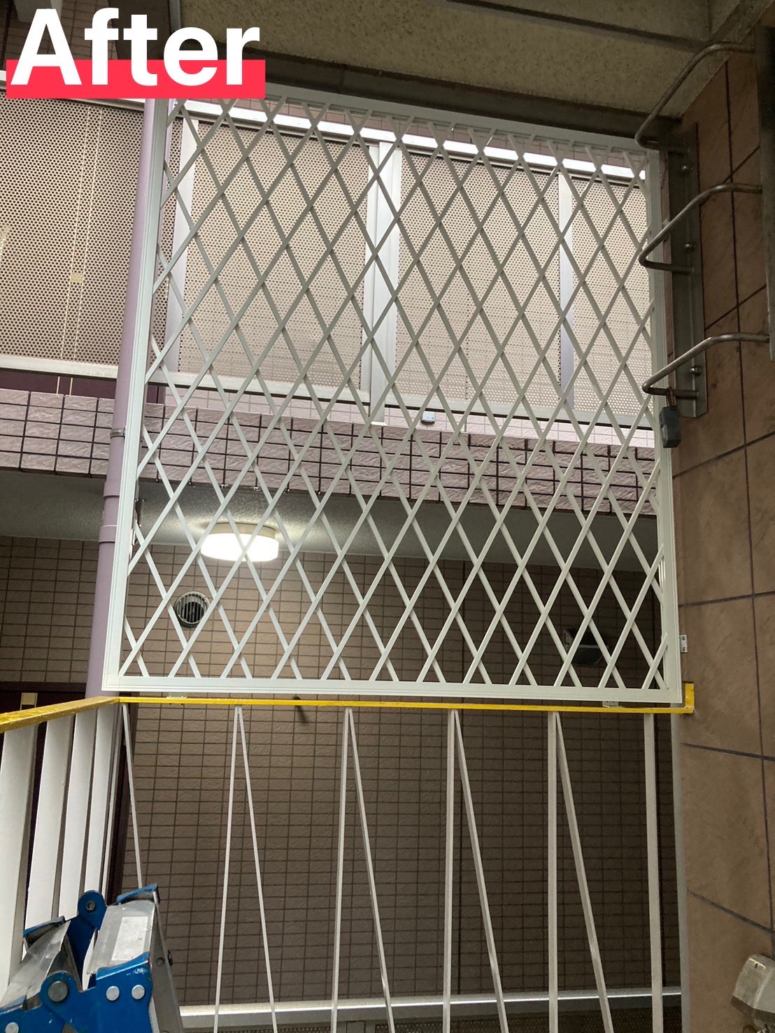 ビルのオーナー様からのご依頼。検査のために屋上へ上がる梯子の横が開けていて転落してしまわないかいつもヒヤヒヤしていたとの事。手摺から天井まで面格子を取り付けました。