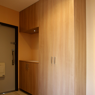 マンションの全面リフォームに合わせて、玄関まわりも改装し、収納を大きくしました。玄関にコートなど大きな衣類を掛けられるのはいいです。